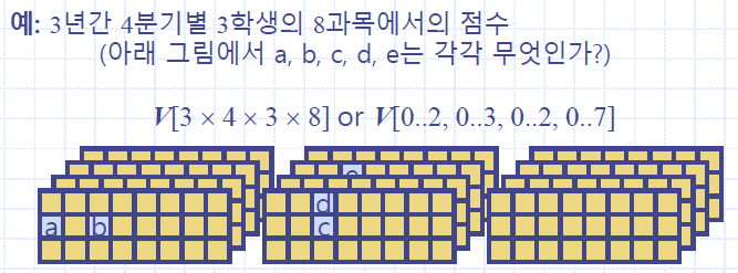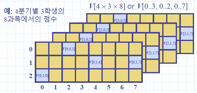 3์ฐจ์ ๋ฐฐ์ด์ 2์ฐจ์ ๋ฐฐ์ด์ด ์ฌ๋ฌ ๊ฐ ํฉ์ณ์๋ ๊ฒ์ด๋ค. (ex. 4๋ถ๊ธฐ๋ณ ์ธ ํ์์ 8๊ณผ๋ชฉ์์์ ์ ์)